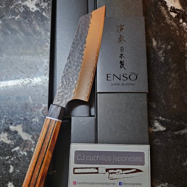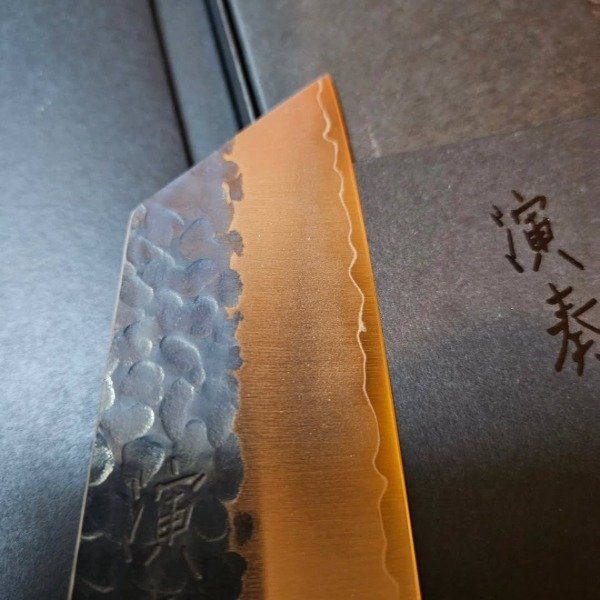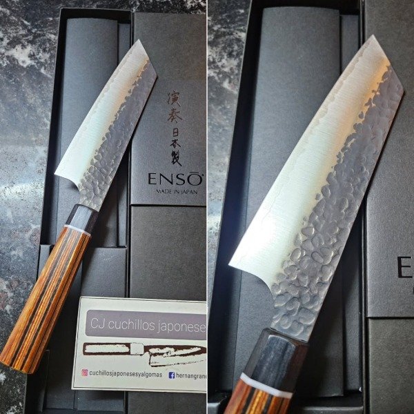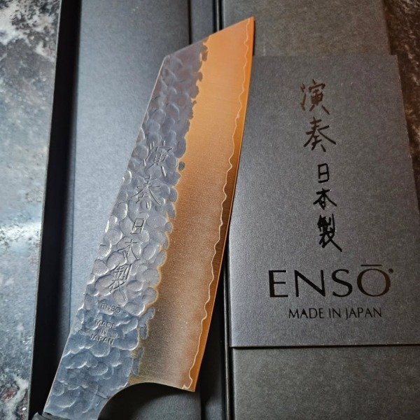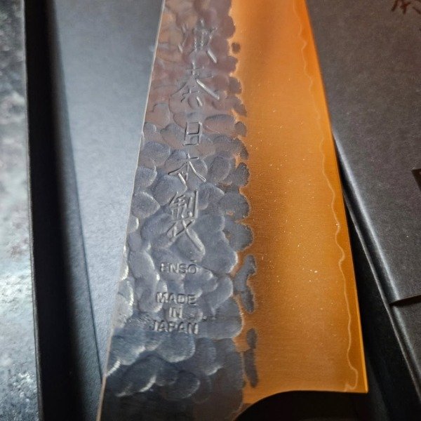 Hoja de 3 capas con núcleo SG2 y textura martillada ("tsuchime") con revestimiento de resina de flúor negra que se aplica permanentemente a la hoja; luego, la hoja se muele hasta obtener un acabado mate con un borde altamente pulido para una apariencia hermosa y duradera La hoja fina está afilada a mano y tiene un ángulo de bisel doble de 12 grados muy afilado.