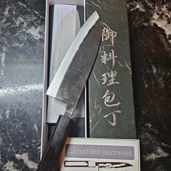 Kurogane Aogami #2 Kuro-uchi 165 mm es un cuchillo de cocina japonés versátil ideal para pelar, recortar, decorar, tallar, picar hierbas... Una excelente opción para cualquiera que se adentre en el mundo de los cuchillos de acero al carbono , que combina un alto rendimiento con la auténtica tradición de la artesanía japonesa. Con un mango octogonal de madera de ebano excelente. Una herramienta de alto nivel a un precio razonable.