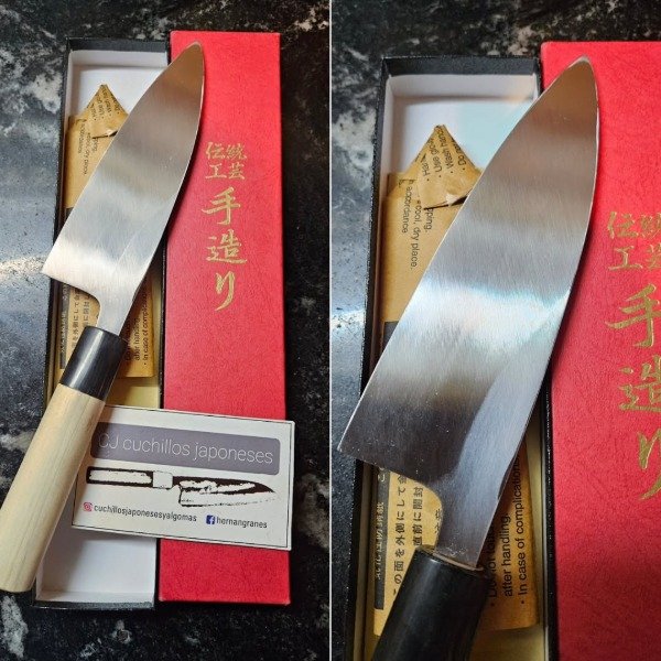 hecha de acero blanco Yasuki (Shirogami) #2 para diestros, con mango profesional, llamado "mango de cuerno de búfalo" (mango de madera de magnolia japonesa y refuerzo de cuerno de búfalo). Altamente recomendado para profesionales por su acabado y ajuste!